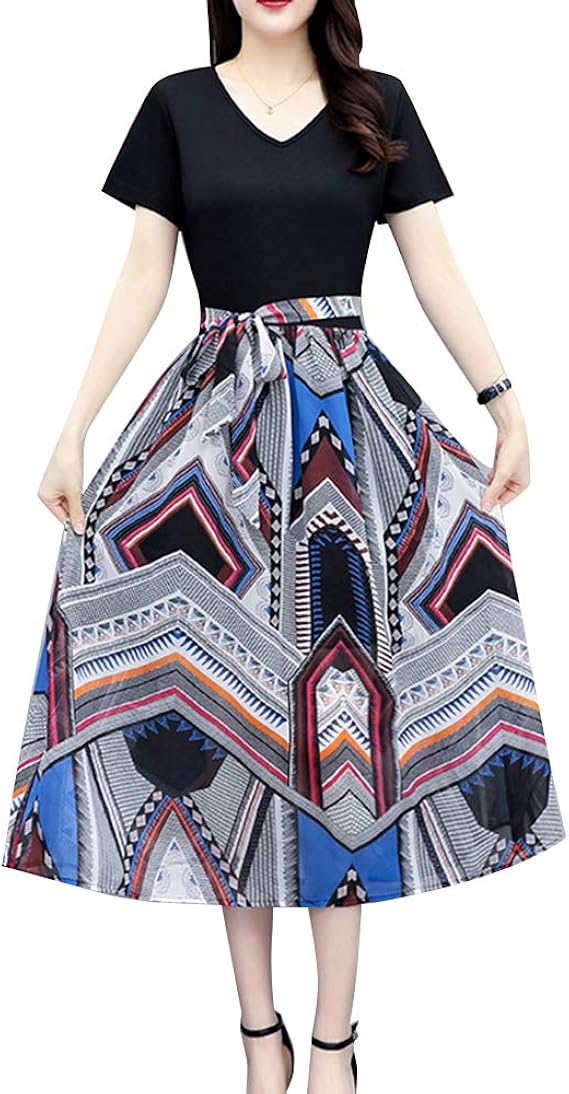 Amazon Co Jp Alagirls ワンピース 蝶結び 半袖 Vネック ミモレ丈 Aライン 着回し プルオーバー シンプル おしゃれ レディースファッション 服 ファッション小物