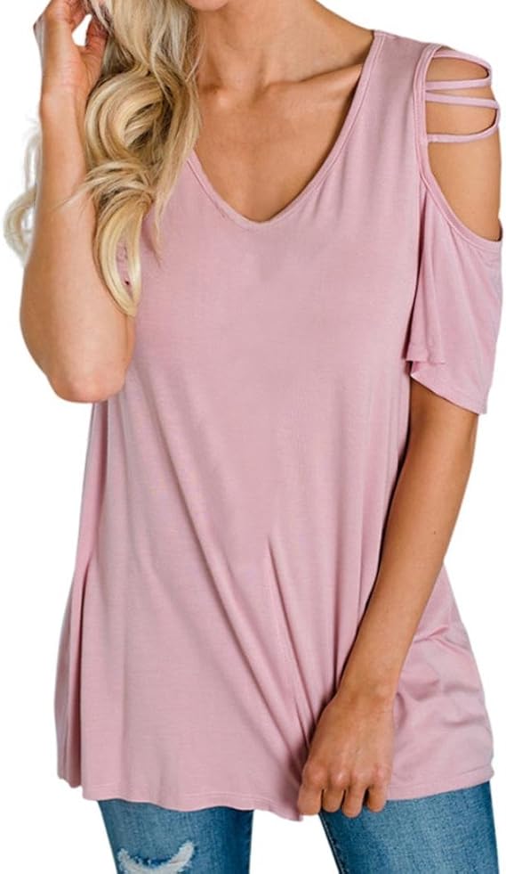 Amazon Yumiki レディースセーター Tシャツ トップス ピンク 可愛い 肩出し オフショア vネック 無地 純色 ゆったり 体型カバー 着やせ カジュアル 普段着 シンプル セクシー Tシャツ カットソー 通販