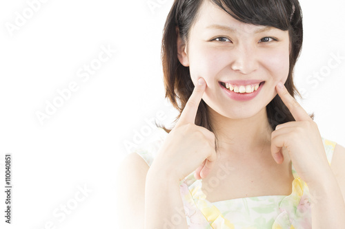 女性 美容 イメージ 私服 20代後半から30代 えくぼに指を 笑顔 カメラ目線 Compre Esta Fotografia E Explore Imagens Semelhantes No Adobe Stock Adobe Stock