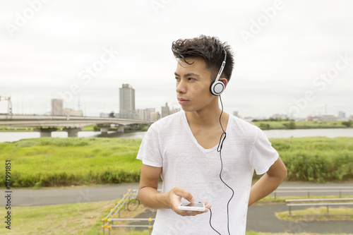 スマホ 音楽を聴く ヘッドホン 男性 10代 20代 屋外 私服 Buy This Stock Photo And Explore Similar Images At Adobe Stock Adobe Stock