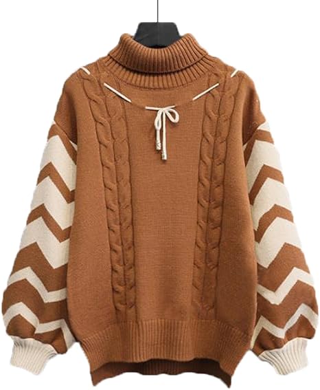 Amazon Aijuan レディース 長袖 セーター ゆったり ハイネック ショート丈 秋服 冬服 春服 インナー アウター 通学 カジュアル パフスリーブ スプライス ストラップ トップス ファッション ブラウンf セーター 通販